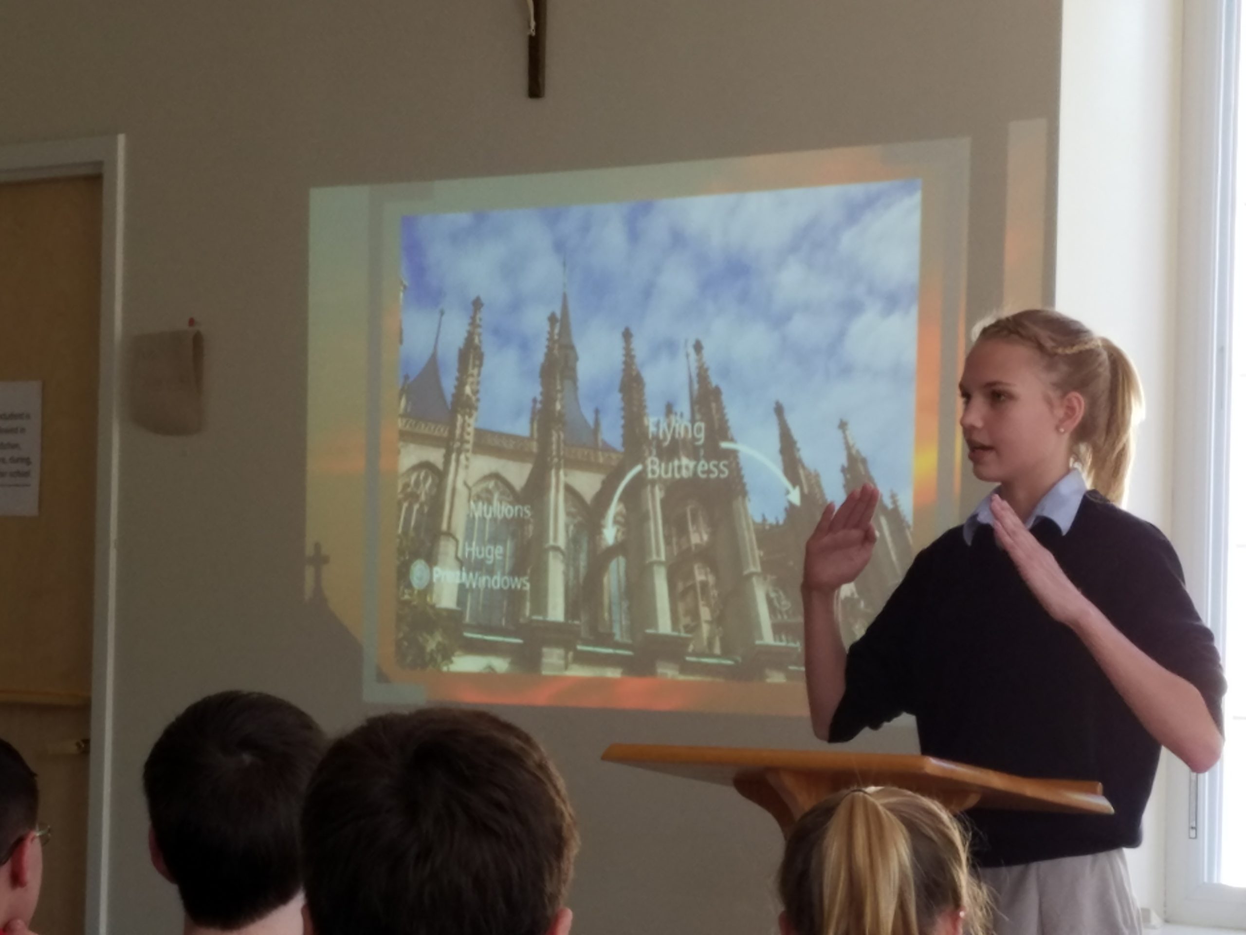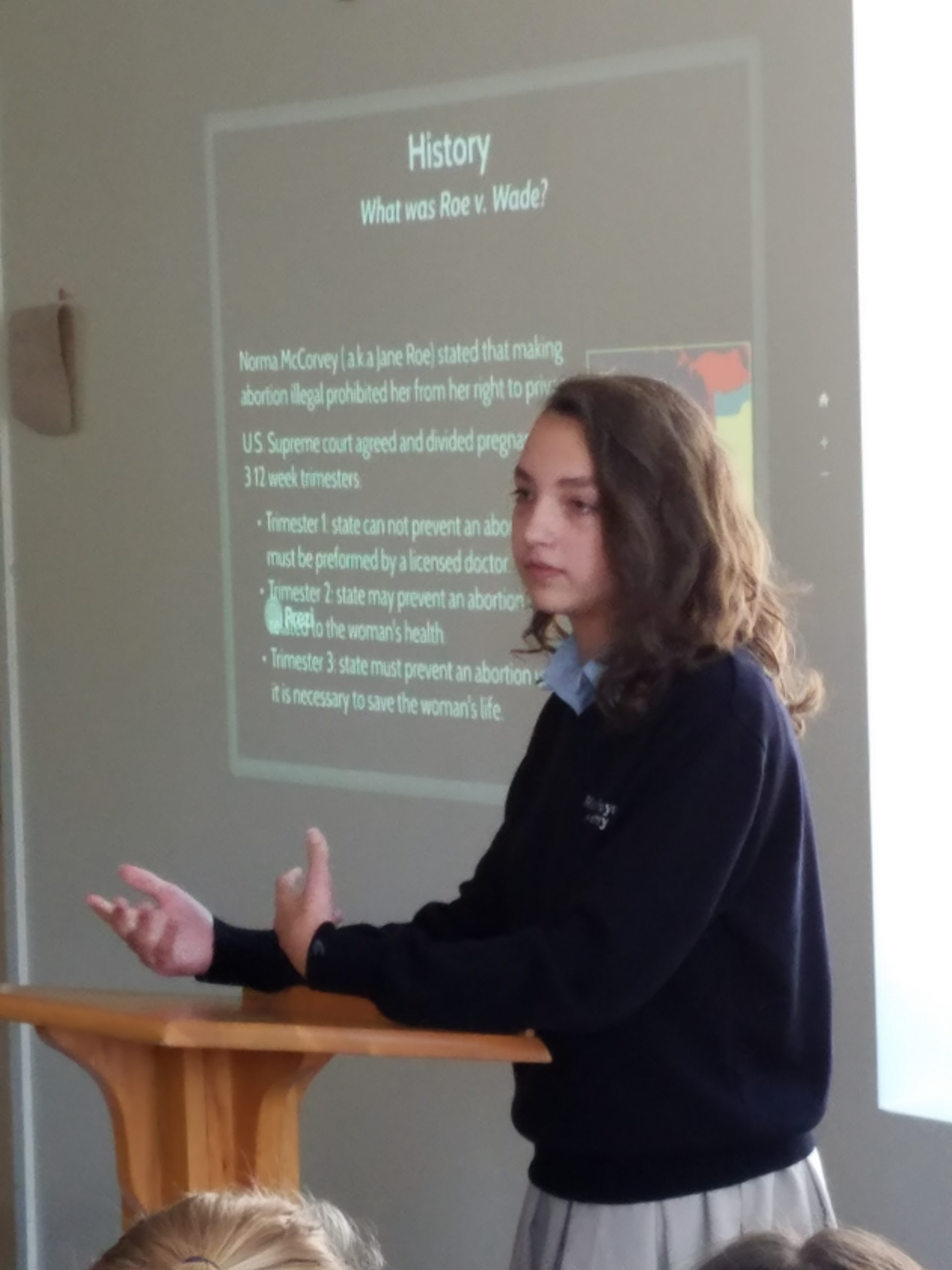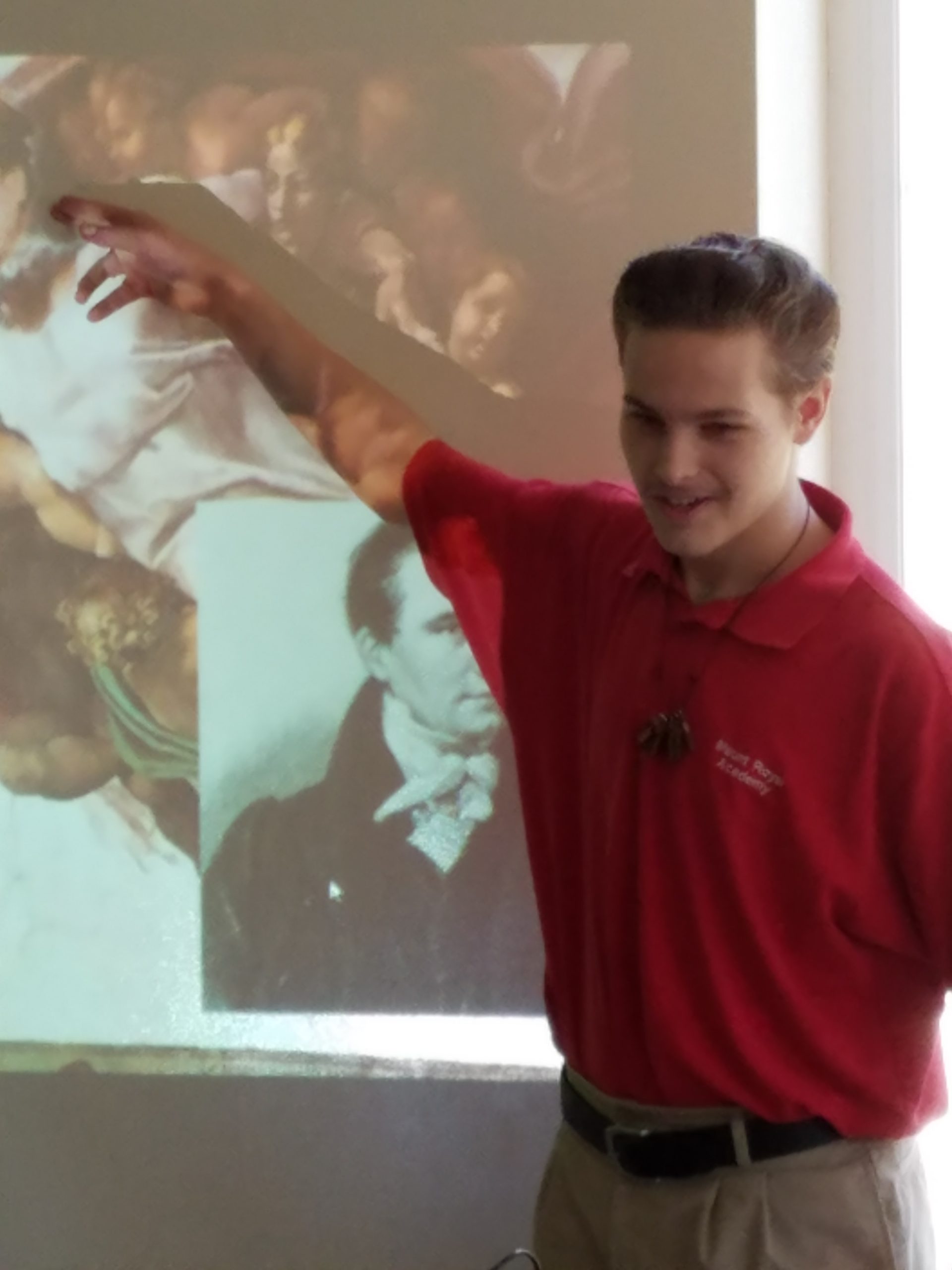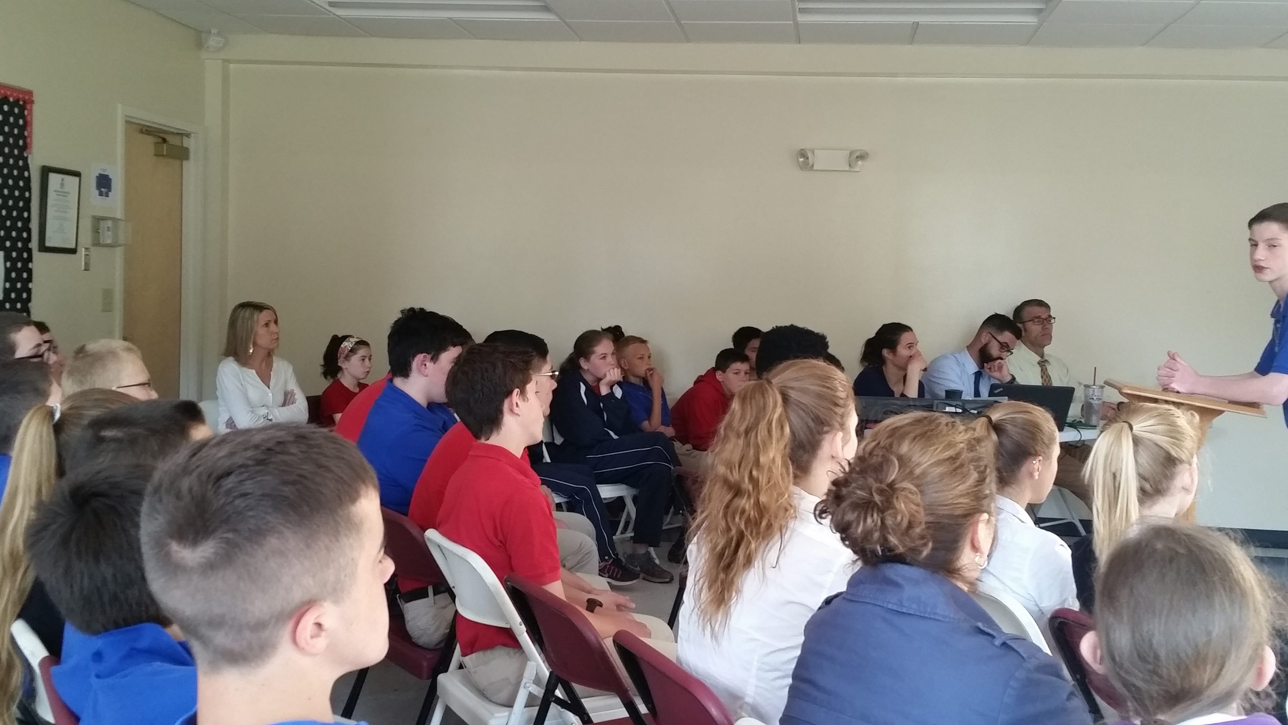 Adolescence and public speaking often lead to little more than sweaty palms, flushed cheeks, and shaky voices. Not so with the 8th grade students today. Each member of the class presented their interdisciplinary projects to teachers, junior high students, and parents. The project entailed creating and delivering a presentation on one topic that encompassed three of the five core academic disciplines: science, math, history, theology, and language arts.