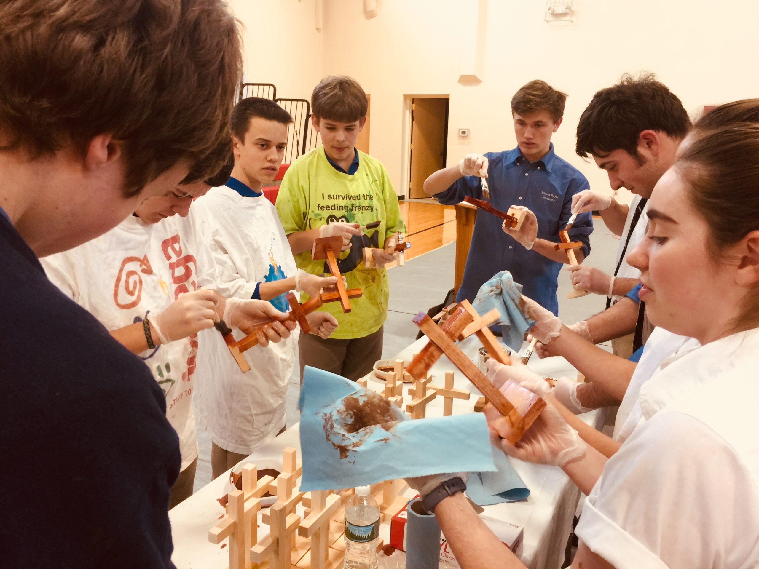 After school, several junior high and high school students volunteered to help assemble and stain over 150 wooden crosses that would be donated to local churches for their Easter liturgies. This is another branch of Hal’s ministry that also explains the the source of his motivation. After getting to know Hal Liberty, one can only conclude that he has taken Our Lord’s words to heart, “whatever you did for one of these least brothers of mine, you did for me.” (Mt 25:40)