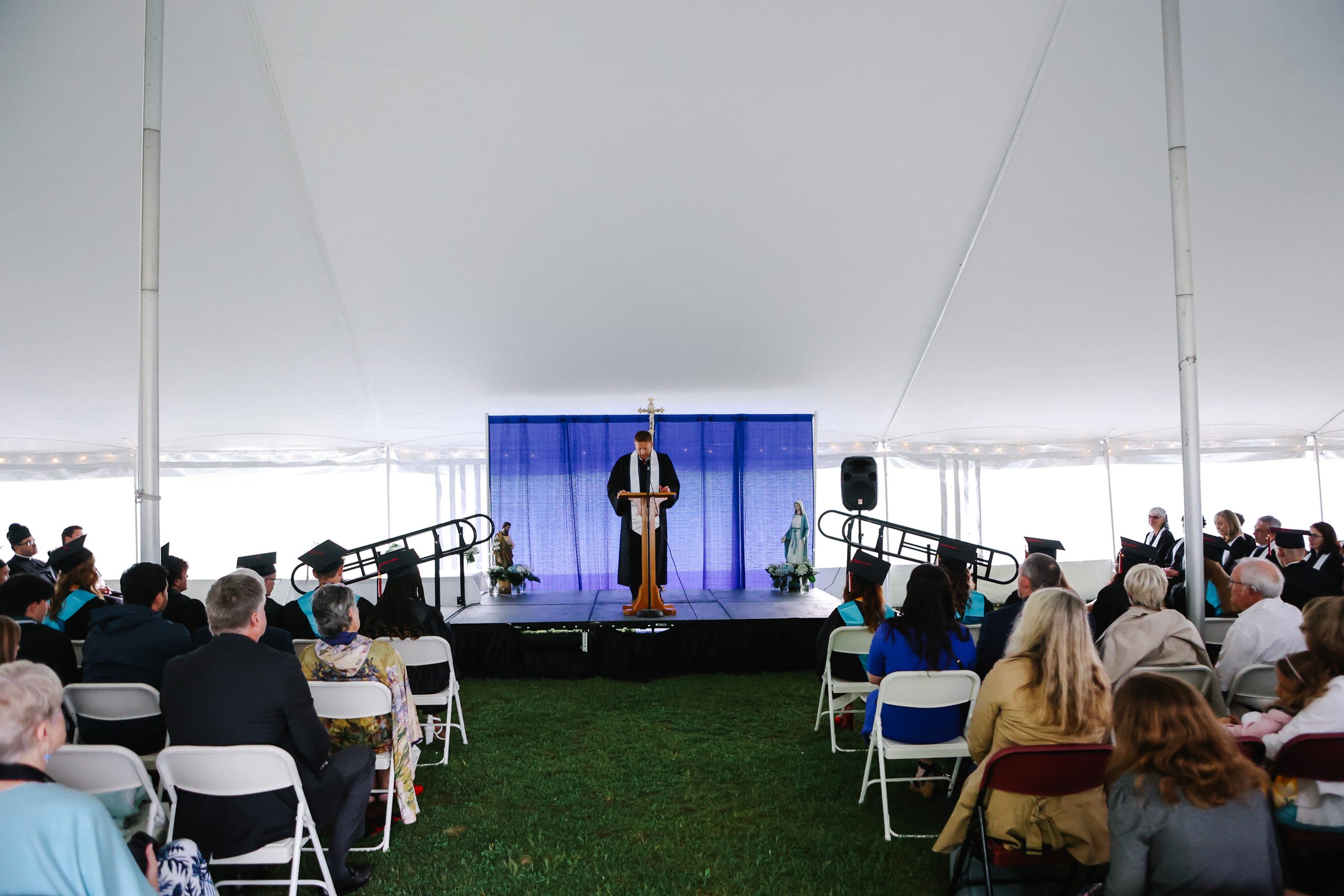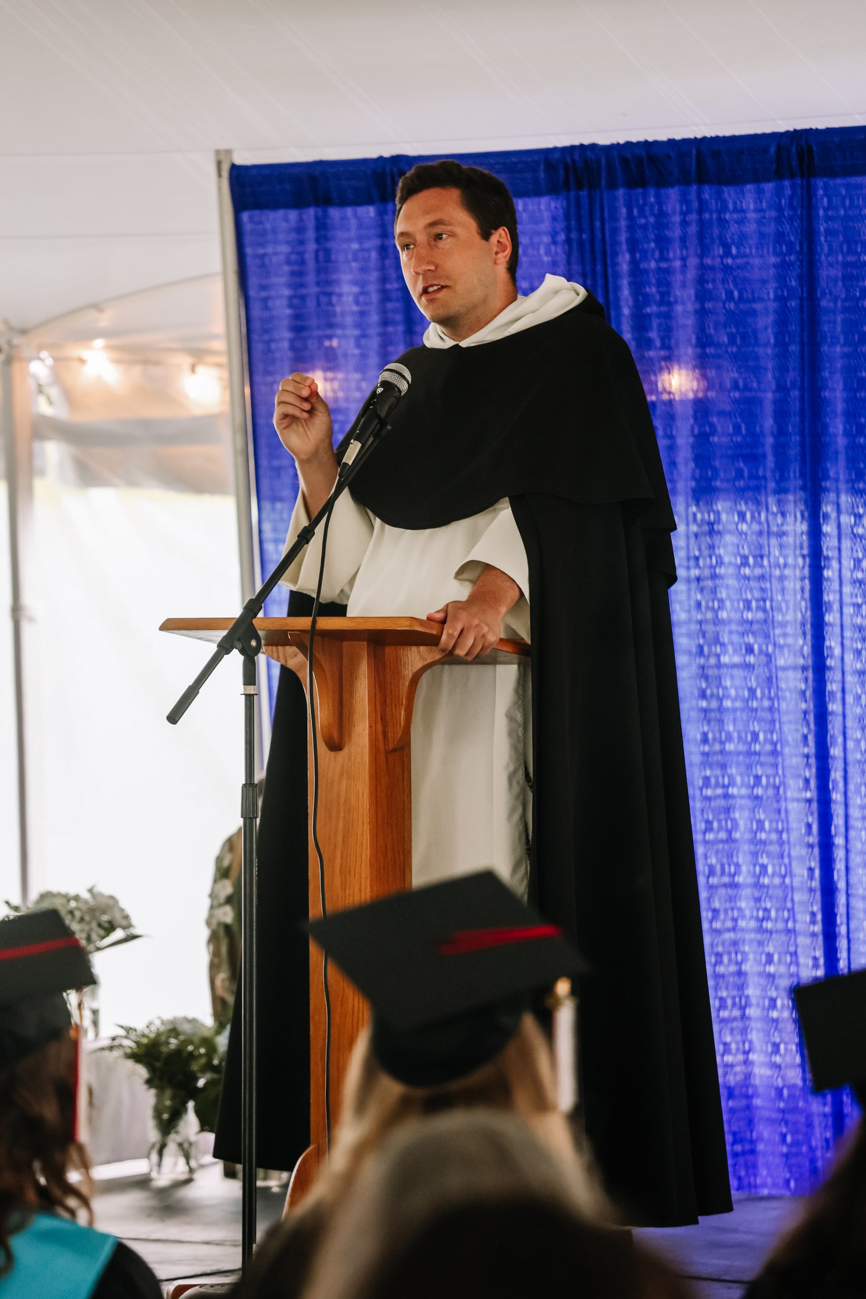 Similar to a college commencement, our school has a penultimate tradition of providing one final lesson for our graduates. This is a commencement address. We are pleased to welcome Fr. Timothy Danahan, who serves as the Chaplain at the Aquinas House at Dartmouth College. He is a Dominican priest, and he even dressed up for us today in his formal attire!