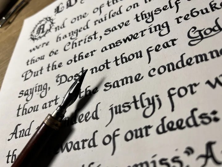 There are many talented artists at our school. This week, I am delighted to share another student’s work published in the Star of Bethlehem. Peter Hogan has been working on his skill with calligraphy for a long time, and his subject matter is almost always faith based. This particular piece displays a passage from the Gospel of Luke 23:39-43. I hope others can appreciate this as much as I have. We might see some more work from Peter in the future.